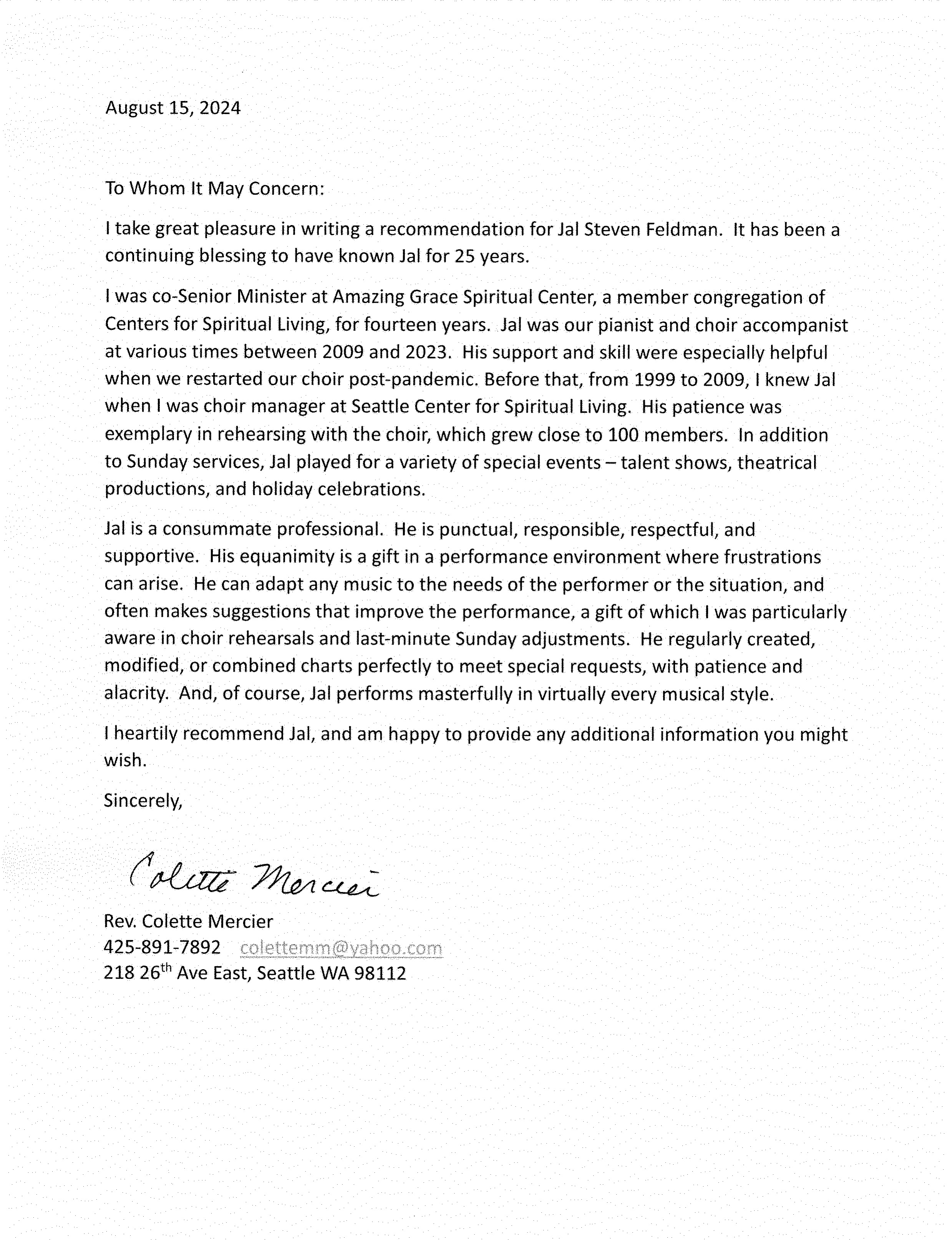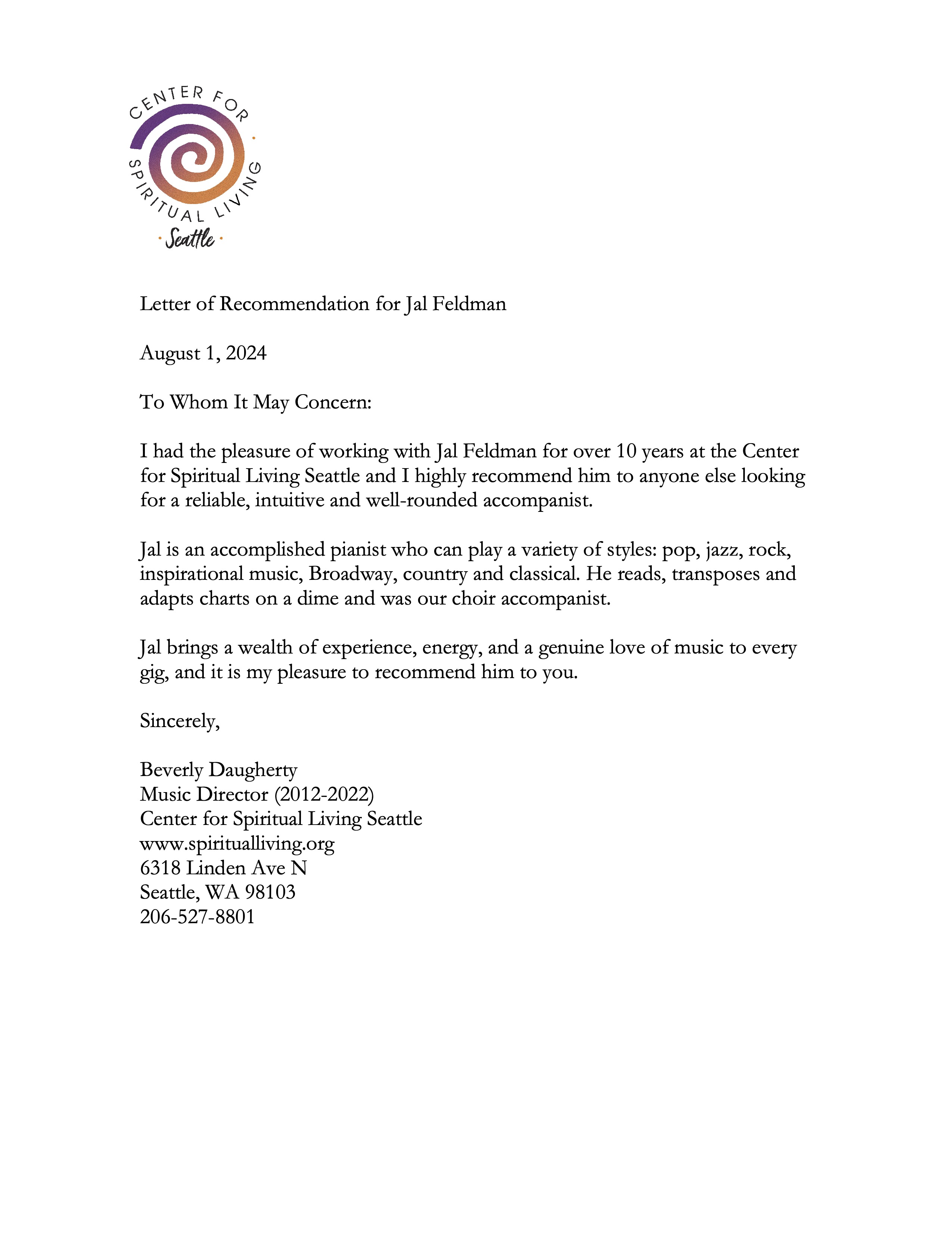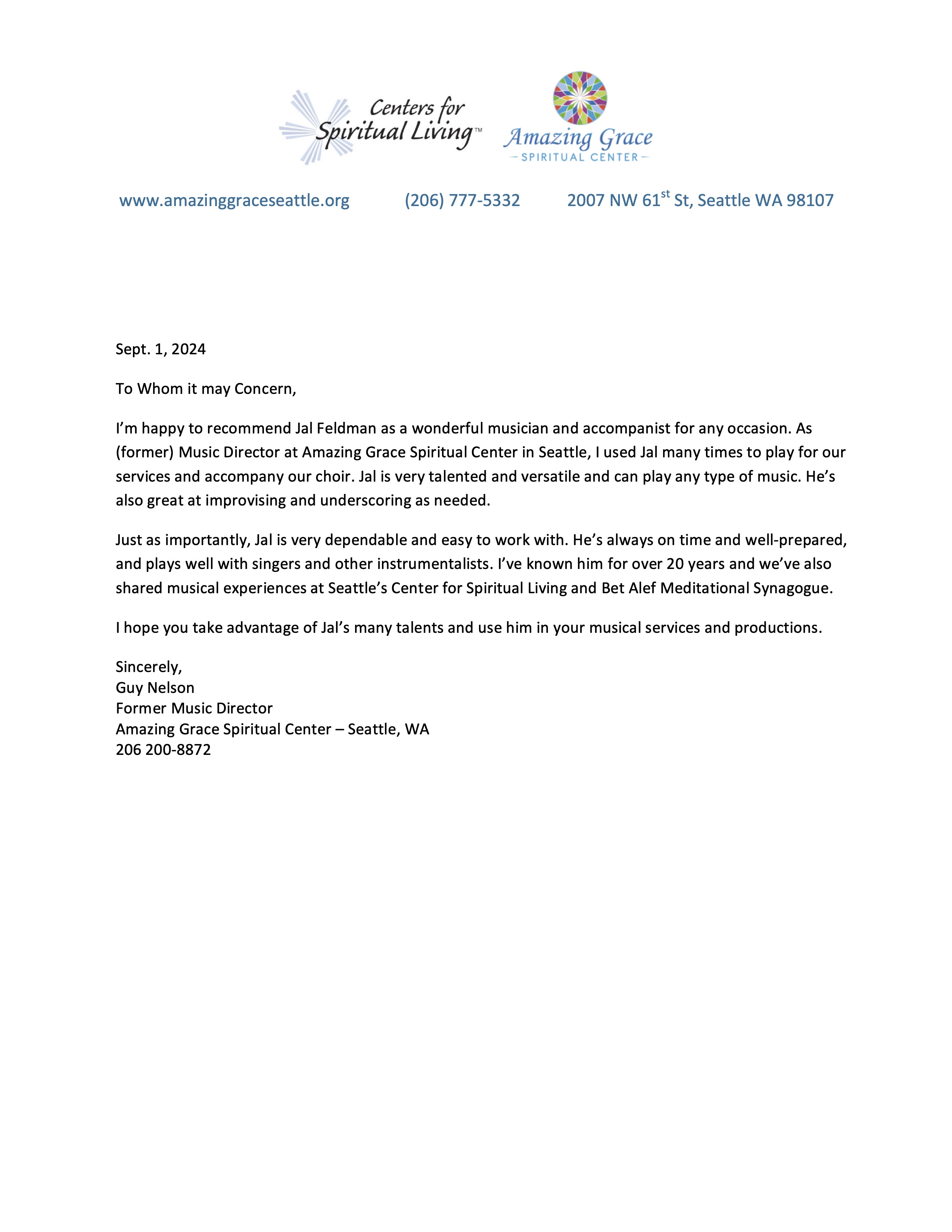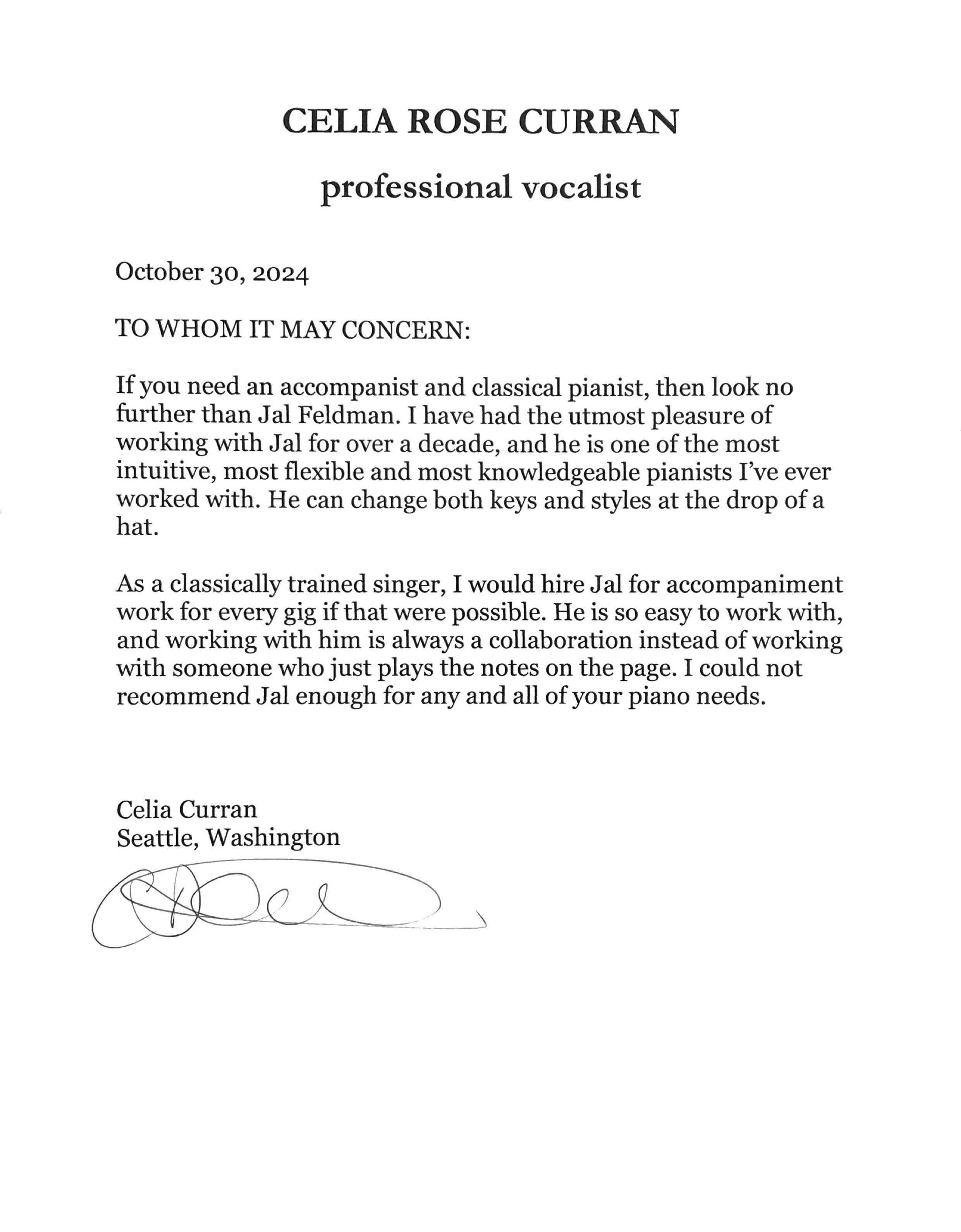 "Jal is an accomplished pianist who can play a variety of styles: pop, jazz, rock, inspirational music, Broadway, country and classical. He reads, transposes and adapts charts, and was our choir accompanist. I highly recommend him to anyone else looking for a reliable, intuitive and well-rounded accompanist."