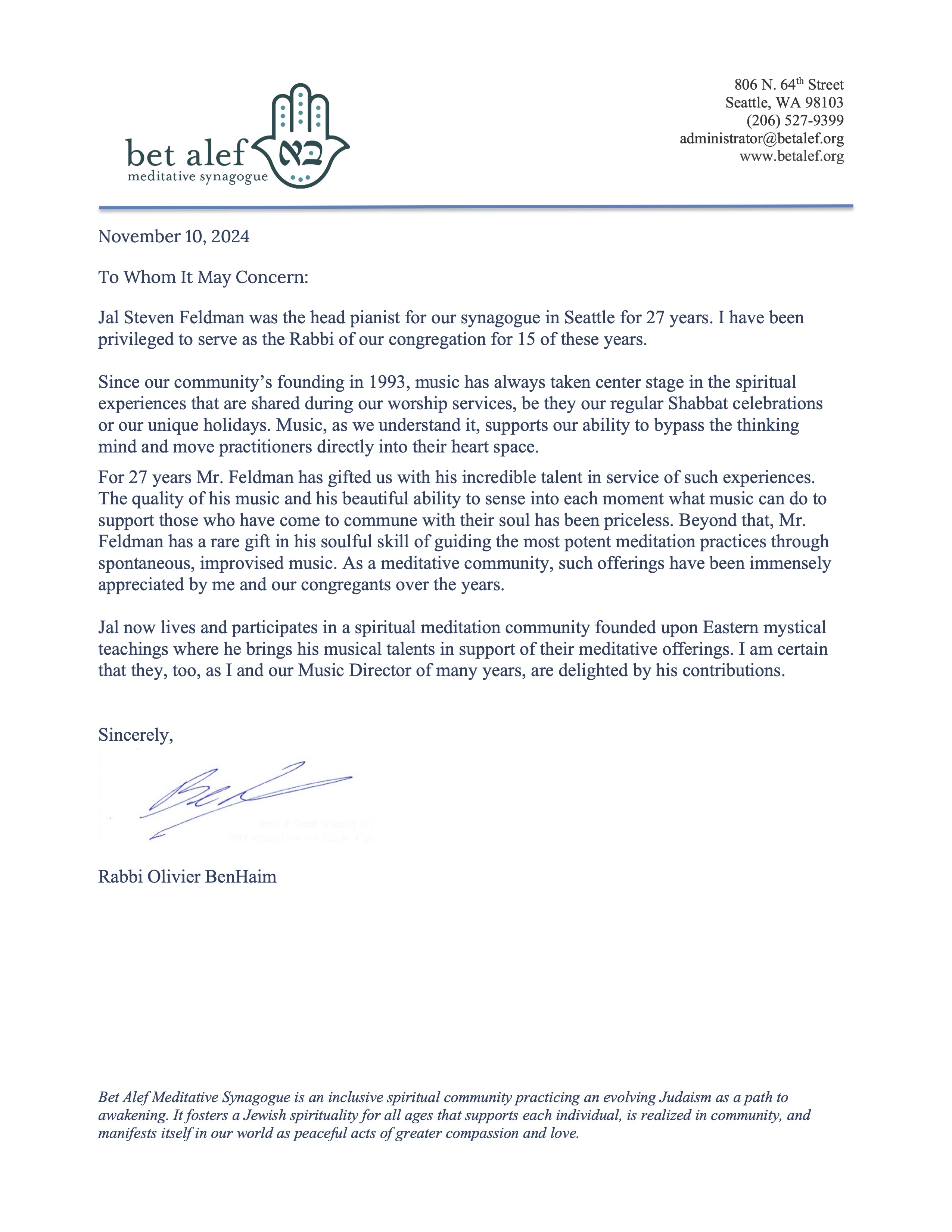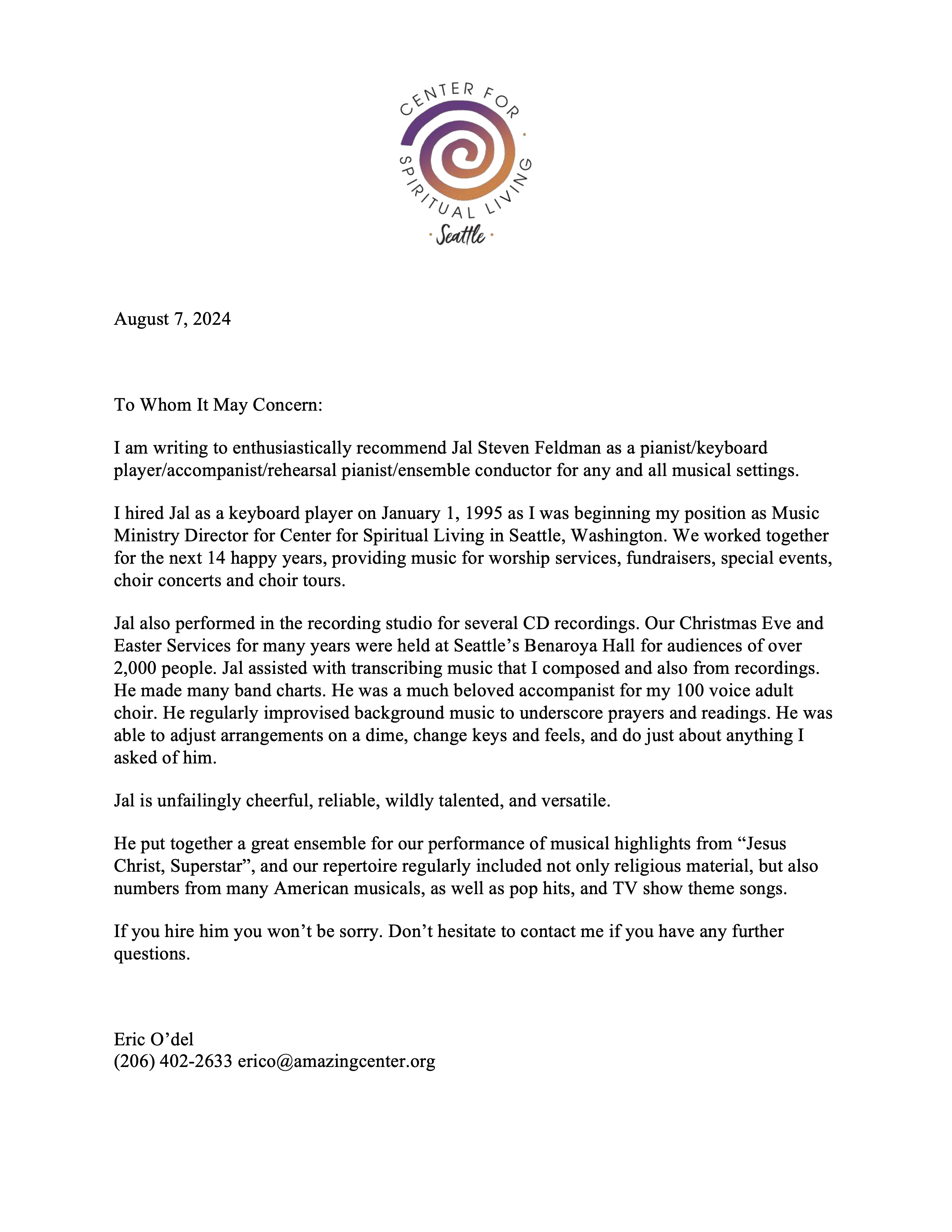 "What sets Jal Feldman apart is his dedication, devotion and presence! Jal is a team player and a musical genius!! A rare combination. His competence, reliability, attention to detail and attitude makes him a vital asset to any musical endeavor."